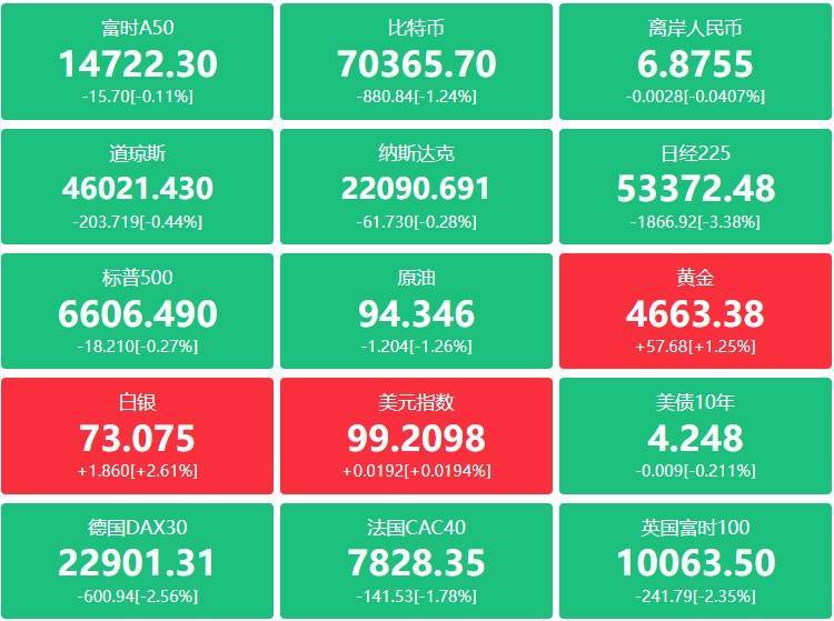 期货:现货黄金跌3.42%报4653.01美元,黄金期货跌4.86%报4657.80美元;现货白银跌3.33%报72.85美元,白银期货跌6.29%报72.840美元,铜期货涨0.46%报5.5240美元,现货铂金跌2.54%;原油期货跌0.18美元,跌幅超过0.18%报96.14美元,布伦特原油涨1.27美元,涨幅超1.18%报108.65美元;天然气期货报3.1660美元,汽油期货报3.1271美元,取暖油期货报4.3420美元。
