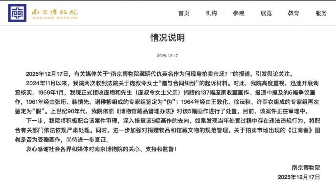 近日,“南京博物院馆藏明代仇英《江南春》现身拍卖市场”引发关注。12月17日晚,江苏省南京博物院发布情况说明: