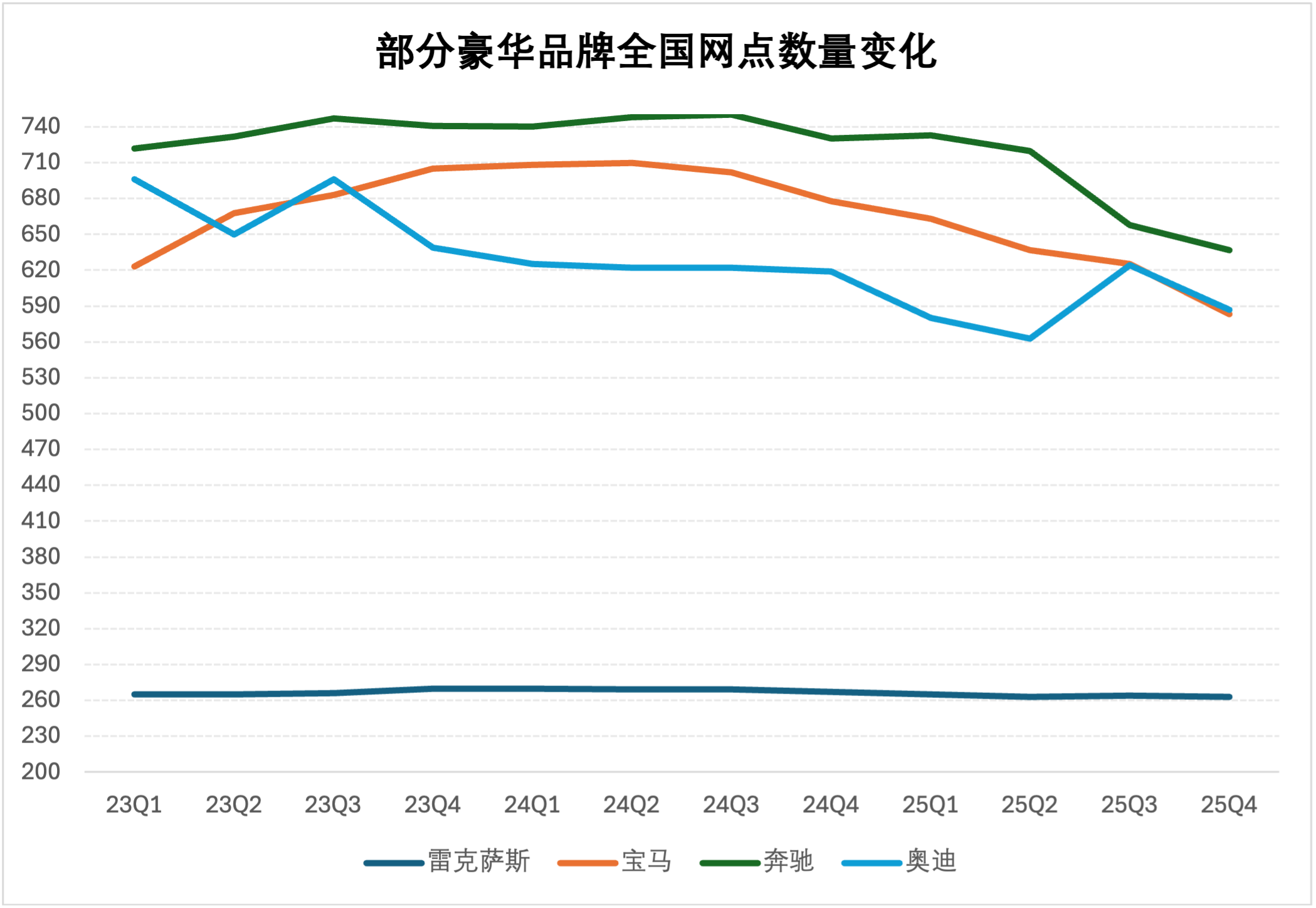杰兰路咨询向界面新闻提供的数据显示,2023年至2025年,雷克萨斯终端网点数量几乎没有变化,而奔驰、宝马和奥迪的渠道规模则出现波动性下滑。