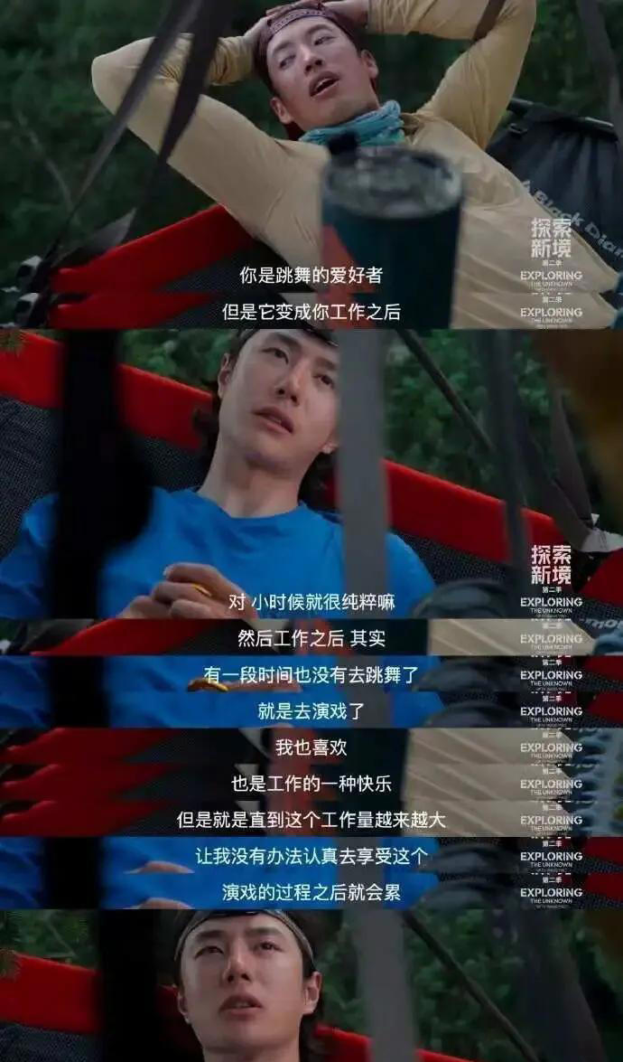他在《探索新境2》里说:“工作量越来越大,让我没办法认真享受演戏的过程了”。想想也是,之前两年他连轴转拍了4部电影、2部剧,还得跑商务、练舞台,就算是铁打的人也扛不住。他说跳舞和演戏都是自己真心喜欢的,但热情被密集的工作慢慢榨干。